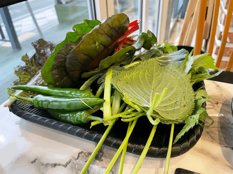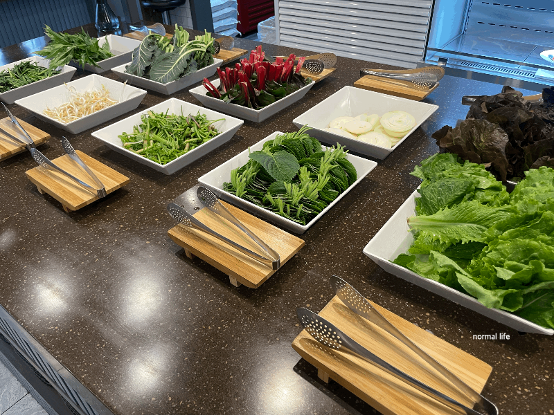 신선한 채소 샐러드바에는 신선초, 부추, 쌈케일, 숙주, 미나리, 적근대, 양파, 깻잎, 상추, 적상추가 마련되어 얇게 썰어낸 대패삼겹살과 함께 곁들여 맛볼 수 있다.