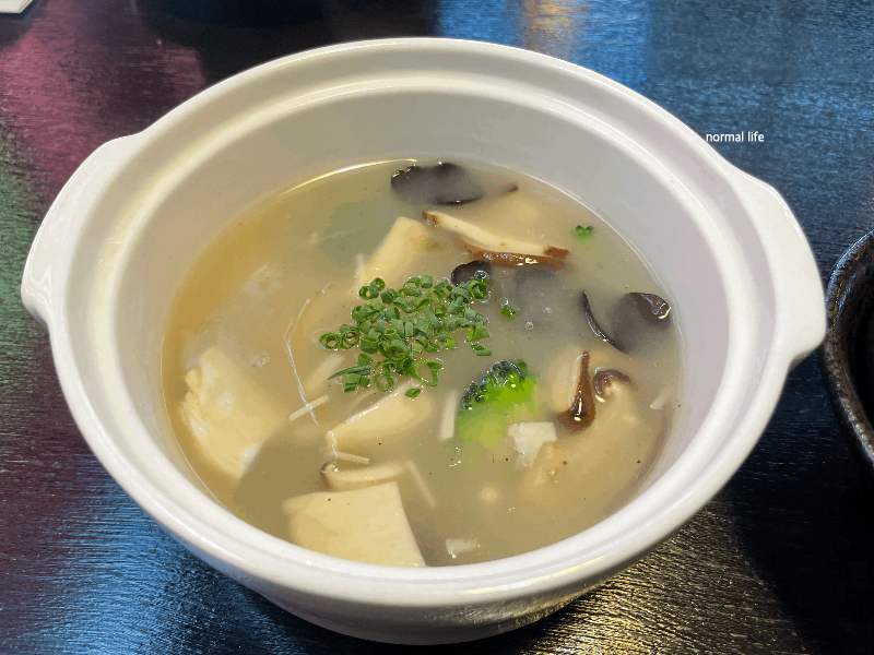 애피타이저 샹구지탕이다. 표고, 새송이, 팽이, 목이버섯, 브로콜리가 들어간 닭육수 베이스의 중국식 수프이다. 담백하고 깔끔한 맛이 매력적인 애피타이저이다.