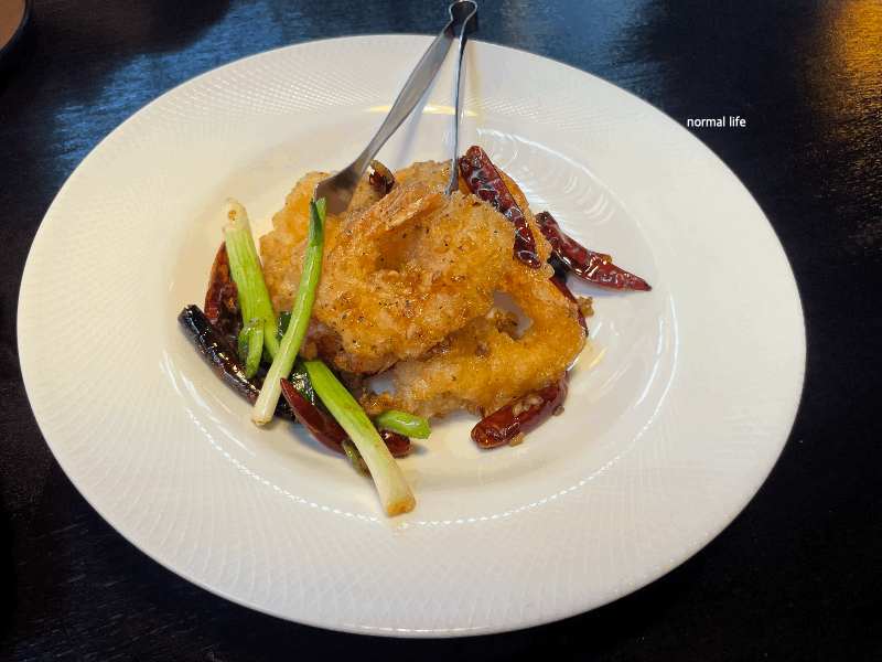 진신 런치코스 A 메인 요리는 블랙페퍼 프라운과 유린기 중 선택을 할 수 있다. 우리는 진신의 시그니처 메인 메뉴인 블랙페퍼 프라운을 선택하였다. 큼직한 새우를 바삭하게 튀겨 산초가루, 통흑후추, 고추, 마늘의 은은한 향을 입힌 중국 사천식 새우요리이다.