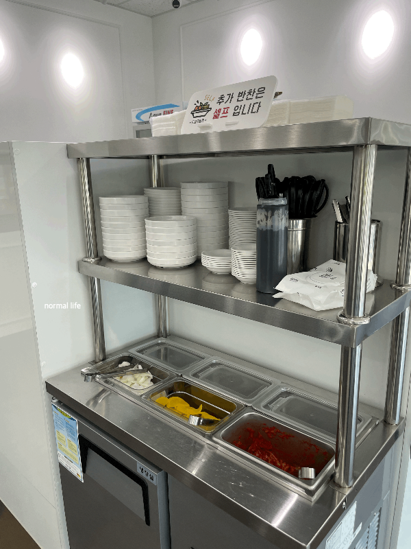 매장 내에는 셀프코너가 마련되어 있어 추가반찬은 직접 가져다 먹어야 한다. 양파, 단무지, 김치, 앞접시, 가위, 집게, 앞치마가 준비되어 있다.