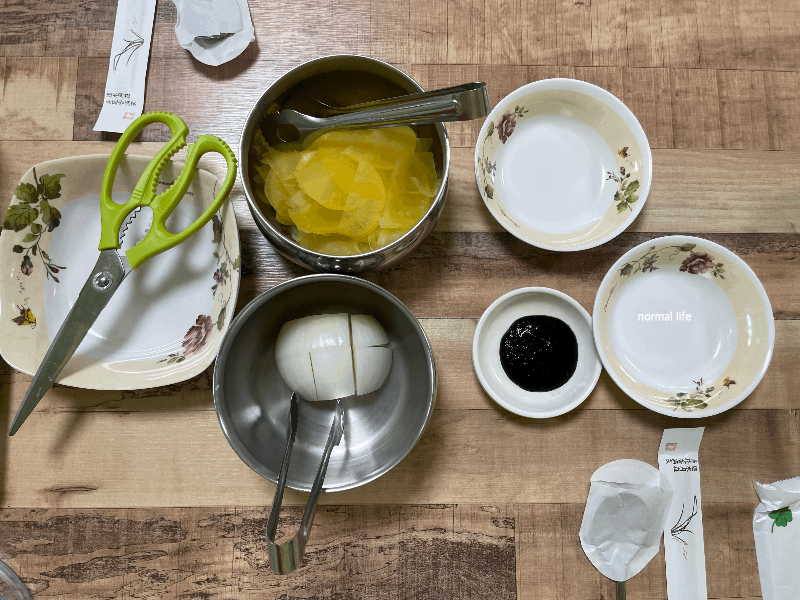 깨끗한 스텐 반찬용기에 양파 반 개와 단무지가 제공된다. 진흥각의 단무지는 기존 시판용 새콤달콤한 단무지가 아닌 직접 만든듯한 단무지이다. 단맛과 신맛이 덜하지만 얇고 아삭아삭한 깔끔한 단무지가 매력적이다. 깔끔하고 가지런한 밑반찬에 진흥각의 청결과 위생에 또 한 번 놀랐다.