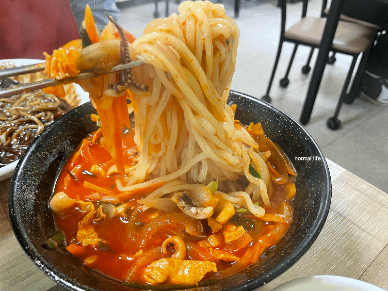 짬뽕 마니아 남편은 짬뽕 곱빼기를 주문하였다. 맵고 얼큰한 맛을 즐기는 남편에게는 조금 심심한 맛이라고 했지만 신선한 야채가 푸짐하게 들어간 오징어는 마음에 드는 눈치였다. 보리새우와 황태가루를 넣어 만든 매운맛 다데기를 넣어 맛보니 조금 더 얼큰하고 진한 맛 가득한 짬뽕을 맛볼 수 있었다.