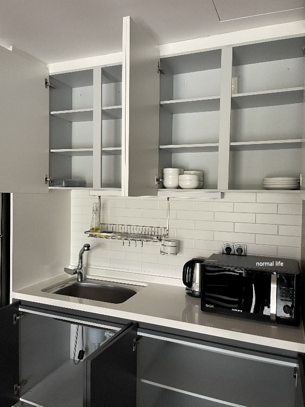 주방에는 간단한 식기인 머그컵, 밥그릇, 국그릇, 원형접시, 수저, 와인오프너, 주방세제가 준비되어 있다.