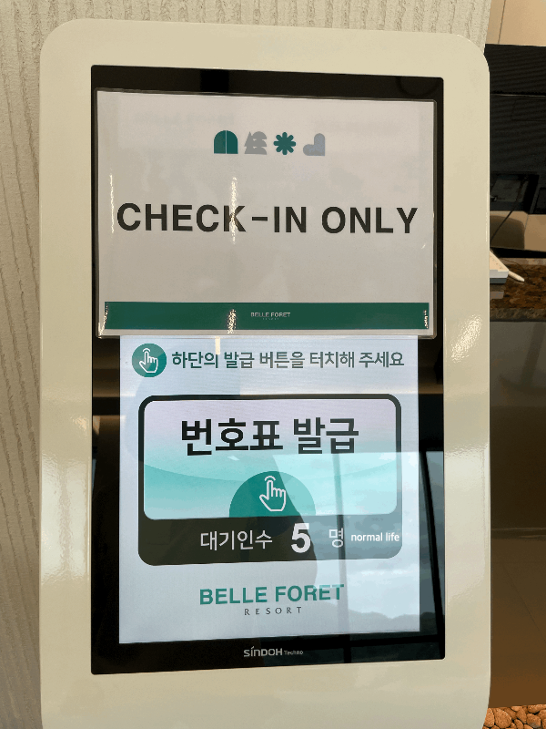 우리는 체크인 시간보다 이른 오후 2시 30분쯤 도착하였다. 비 오는 금요일이라 얼리 체크인을 기대하였으나 3시부터 체크인이 가능하다 하여 웰컴센터에서 번호표를 발급받고 30분 대기한 후 객실을 배정받을 수 있었다. 벨포레리조트를 이용할 예정이라면 체크인 시간인 오후 3시에 맞춰 방문하길 추천하고 싶다.