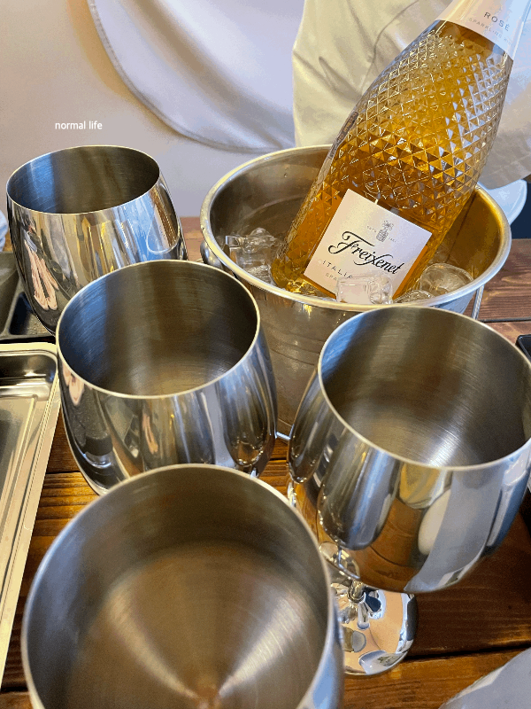 밤밤테이블은 외부음식과 주류 반입 금지로 매점에서 구매해야 한다. 우리는 직접 준비한 스파클링 와인을 2병 준비해서 콜키지를 이용하였다. 와인 2만 원, 양주 4만 원으로 2병째부터 2만 원이다. 와인 두병 콜키지 비용으로 4만 원을 지불하였고 아이스버킷과 와인잔을 준비해 주셨다.