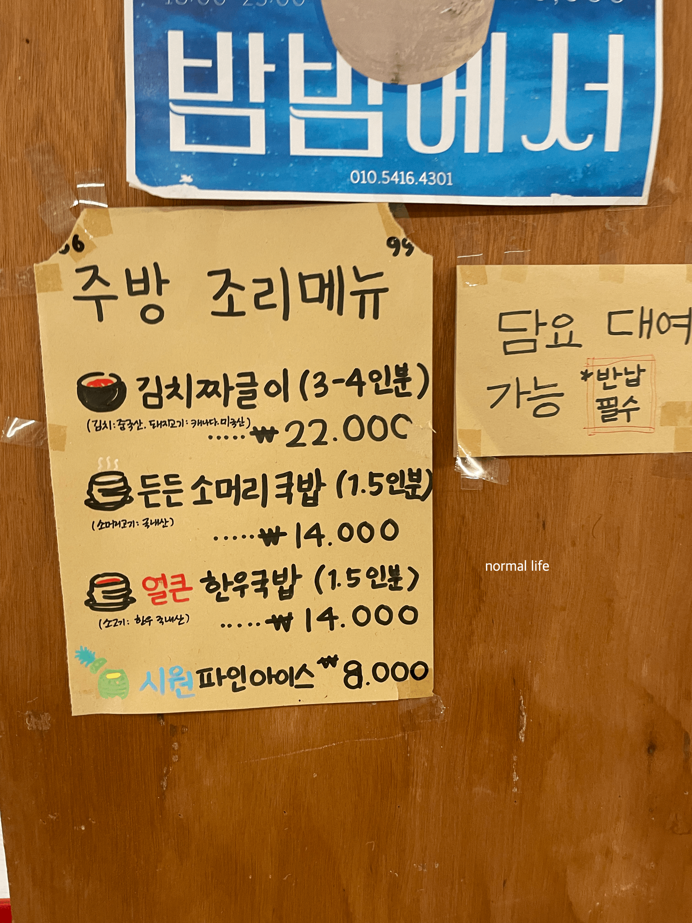 주방에서 조리해서 나오는 김치짜글이 22,000원 든든 소머리국밥 14,000원 얼큰 한우국밥 14,000원도 주문이 가능하다.