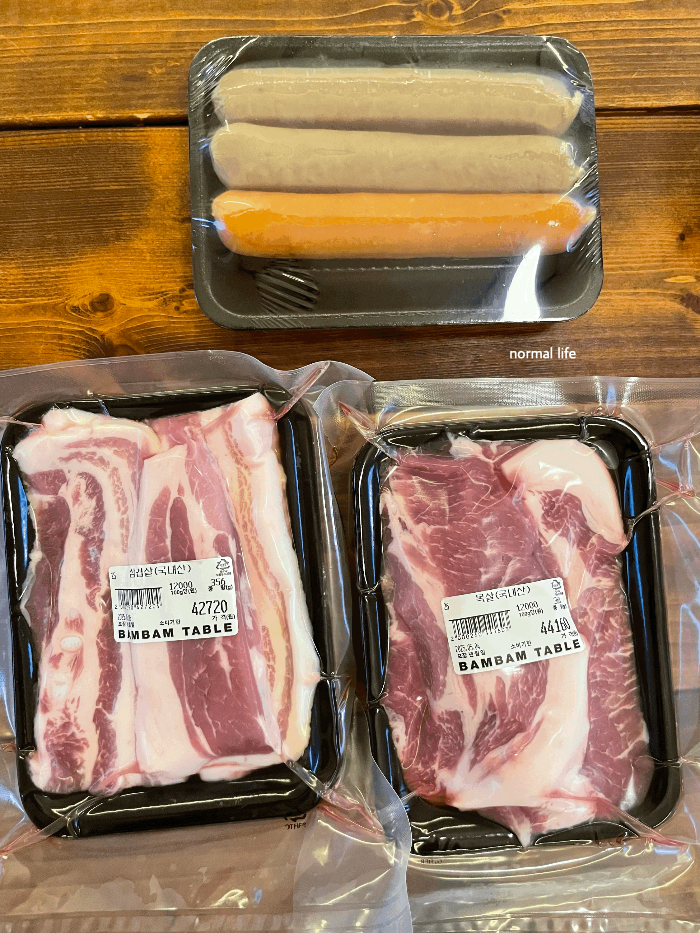 밤밤테이블 매점에서 바베큐용으로 항정살 300g, 삼겹살 300g, 목살 300g 2팩, 소시지 3개 세트를 구매하였다.