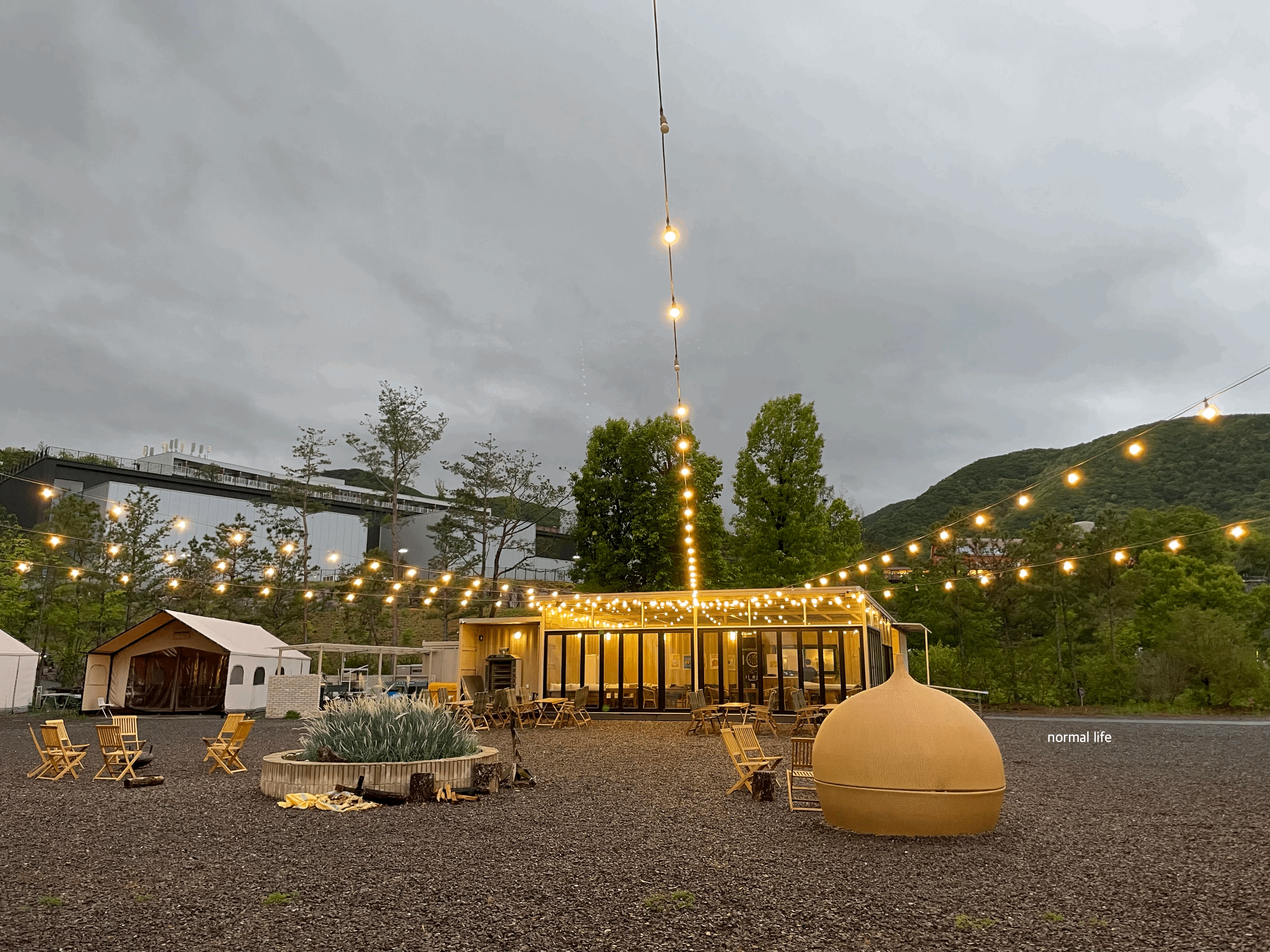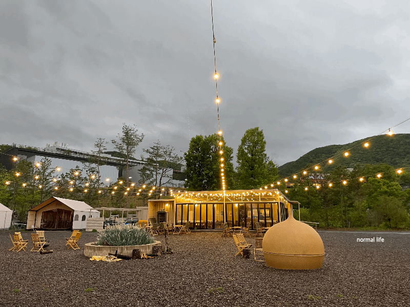 우리가 묵었던 벨포레리조트 102동에서 밤밤테이블까지 아이들과 산책 겸 걸어서 5분 거리여서 이동하기도 편리하였다. 하루 종일 부슬부슬 비가 내려서 예약을 취소해야 하나 망설였지만 아이들에게 자연 속 캠핑을 경험해주고 싶어 예약했던 저녁 7시 타임에 방문하였다. 비가 오지 않는 날에는 마당에서 불멍을 해주시는데 우리가 방문한 날은 불멍이 할 수 없어 아쉬웠다.