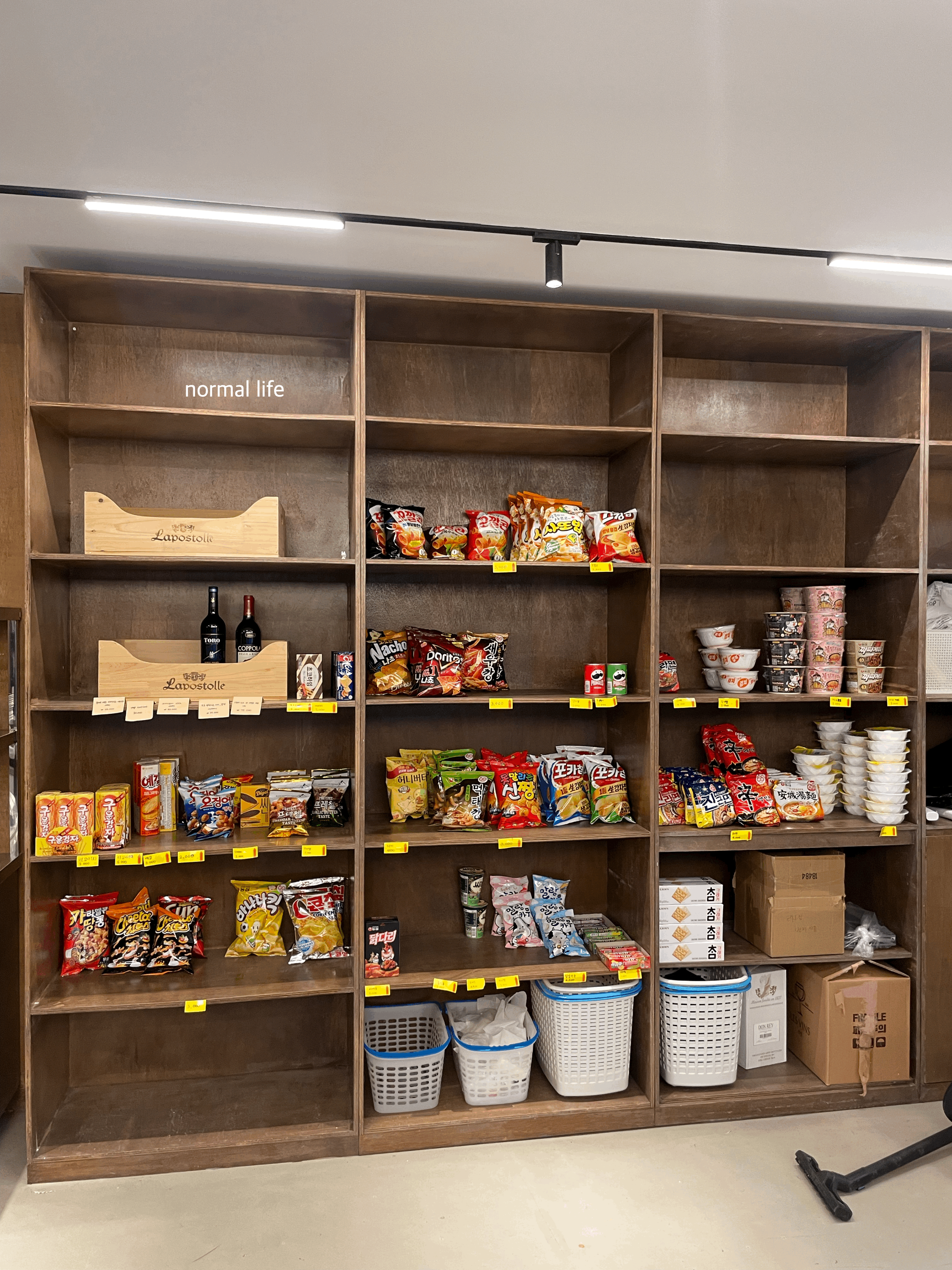 과자와 라면, 컵라면, 햇반도 준비되어 있다. 새우깡 꼬깔콘 포카칩 치토스 콘칩 등 스낵류 3,000원 육개장 사발면 2,000원 붉닭볶음면 짜장 컵라면 3,000원 진라면 신라면 안성탕면 봉지라면 4,000원 햇반 2,000원이다.