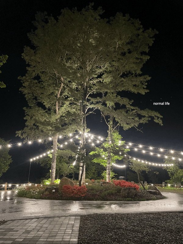 우리가 묵었던 벨포레리조트 102동에서 밤밤테이블까지 아이들과 산책 겸 걸어서 5분 거리여서 이동하기도 편리하였다. 하루 종일 부슬부슬 비가 내려서 예약을 취소해야 하나 망설였지만 아이들에게 자연 속 캠핑을 경험해주고 싶어 예약했던 저녁 7시 타임에 방문하였다. 비가 오지 않는 날에는 마당에서 불멍을 해주시는데 우리가 방문한 날은 불멍이 할 수 없어 아쉬웠다.