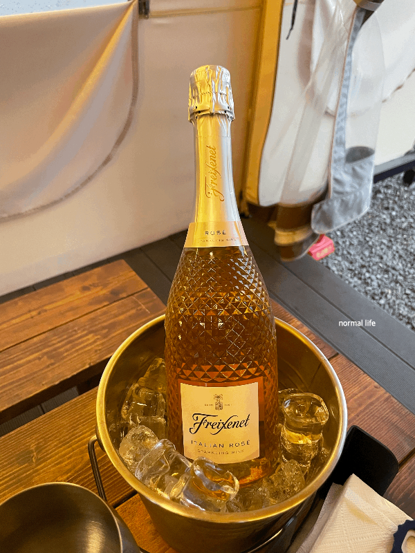 밤밤테이블은 외부음식과 주류 반입 금지로 매점에서 구매해야 한다. 우리는 직접 준비한 스파클링 와인을 2병 준비해서 콜키지를 이용하였다. 와인 2만 원, 양주 4만 원으로 2병째부터 2만 원이다. 와인 두병 콜키지 비용으로 4만 원을 지불하였고 아이스버킷과 와인잔을 준비해 주셨다.