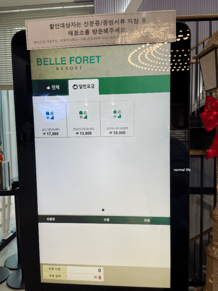 벨포레리조트 미디어아트센터 이용요금은 성인 17,000원 청소년(14세-19세) 13,000원 어린이(8세-13세) 10,000원 유아(36개월 이하) 무료이다. 플레이존 단독 이용 시 성인, 어린이 5,000원이고 평일 현장 구매만 가능하다.