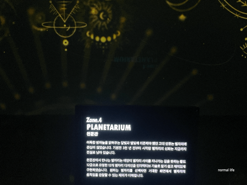 황도 12궁의 별자리를 인터랙티브 기술로 알기 쉽고 재미있게 감상할 수 있는 ZONE.4 천문관이다.