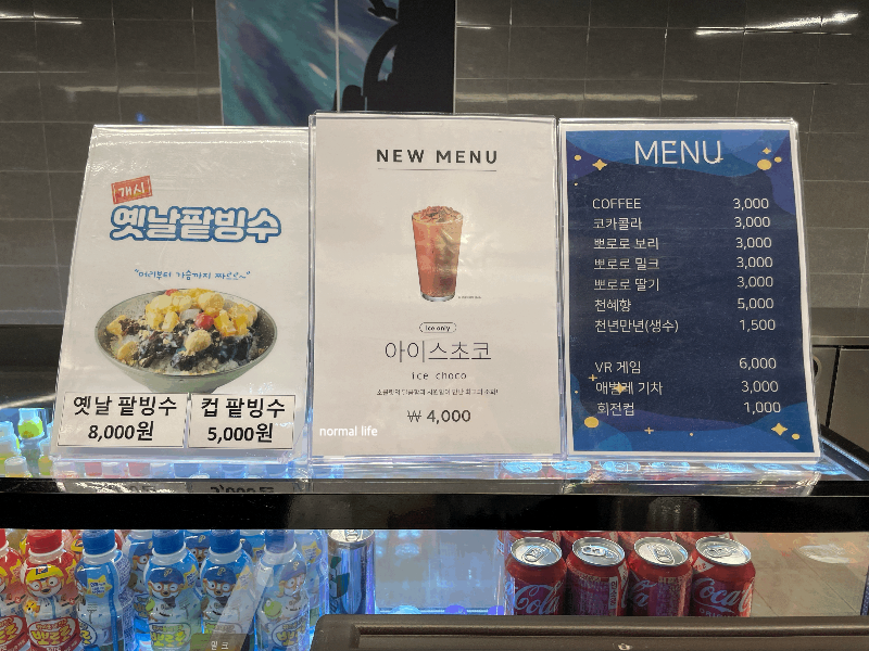 칸타타, 카페베네 #파우치커피 3,000원 #뽀로로음료 3,000원 #콜라 3,000원 #천혜향 5,000원 #아이스초코 4,000원 #생수 1,500원 #컵 팥빙수 5,000원 #옛날 팥빙수 8,000원이다.