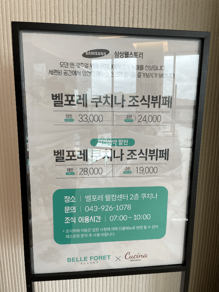 벨포레리조트가 품은 아름다운 호수를 바라보며 조식을 즐길 수 있는 벨포레리조트 쿠치나를 방문해 보았다. 증평 블랙스톤 벨포레리조트는 2019년 오픈하여 쿠치나 내부는 깔끔하고 세련된 공간으로 꾸며진 모던 앤 캐주얼 레스토랑이다. 야채와 과일의 신선도가 훌륭했으며 엄선된 다양한 메뉴를 즐길 수 있었다. 체크인 시 사전 예약하면 정상가보다 할인된 가격 대인 28,000원 소인 19,000원에 즐길 수 있다.