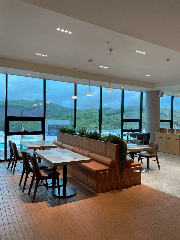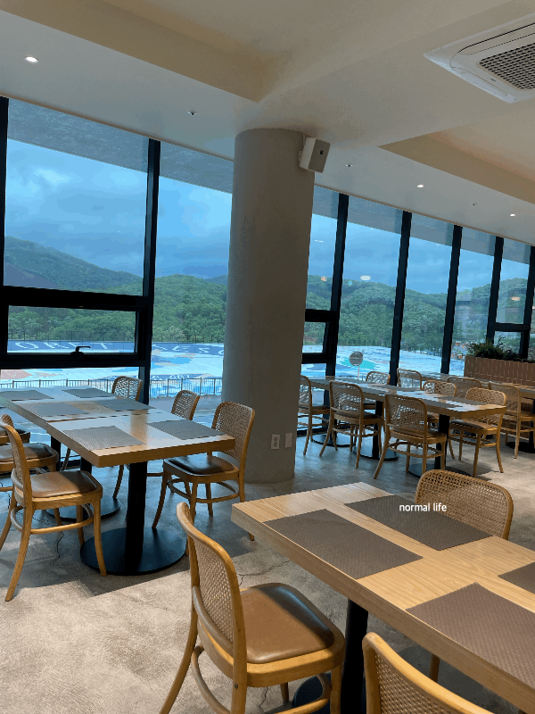 벨포레 쿠치나에 들어서면 숲과 호수에 둘러싸여 어느 곳에 앉든 푸르른 자연을 즐기며 조식뷔페를 즐길 수 있다. 아침부터 비가 부슬부슬 내리는 아침이었는데 쿠치나 창 너머로 물안개가 피어오르는 산새가 장관이었다.
