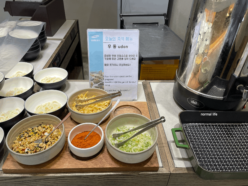 기호에 따라 즐길 수 있는 즉석 메뉴 우동이다. 준비된 우동면에 각종 고명을 올리고 따뜻한 육수를 부어 따뜻하게 맛볼 수 있다.