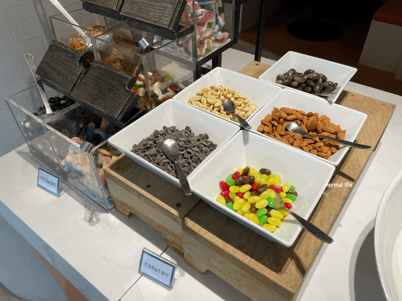 아몬드 후레이크, 오레오 오즈 두 가지 시리얼이 준비되어 있다. 토핑으로 즐길 수 있는 견과류, 초콜릿이 있고 아이들이 좋아하는 젤리도 준비되어 있다.