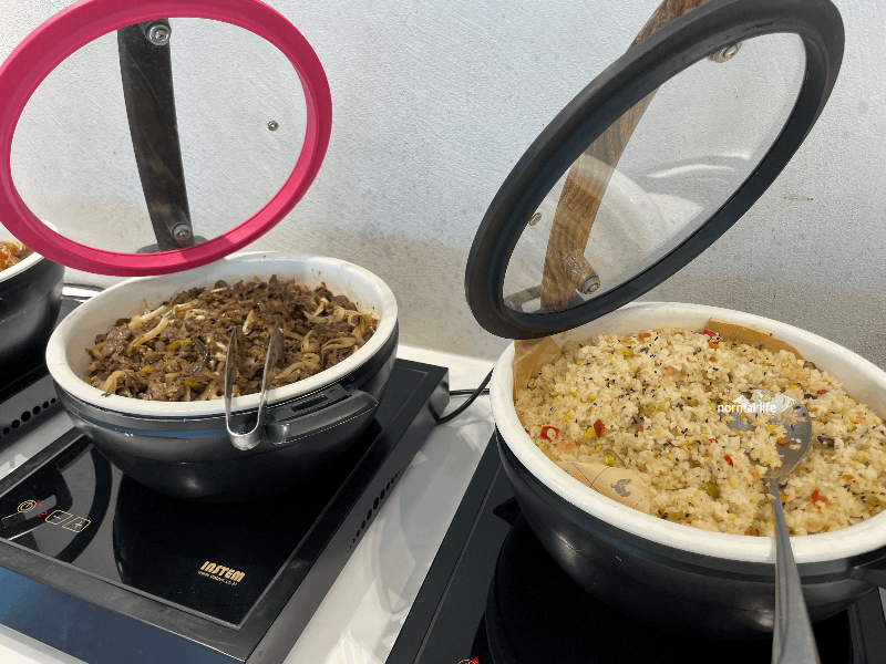 볶음밥, 불고기, 닭고기간장조림, 스크램,그릴야채, 베이컨 소시지 오븐구이, 함박스테이크, 가지튀김이 준비되어있는 HOT 메뉴들이다.
