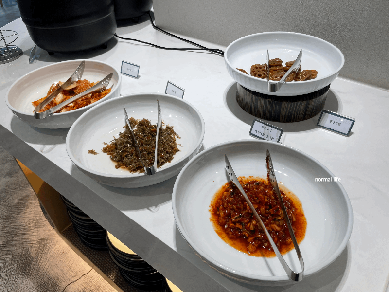 쌀밥, 오징어젓, 조림멸치, 배추김치, 열무김치, 연근조림, 미역국, 죽 등이 준비되어 있어 맛있는 한식을 즐길 수 있다.
