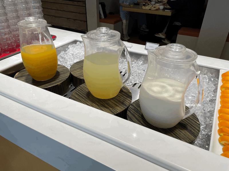흰 우유, 사과주스, 오렌지주스가 시원하게 준비되어 있어 마음껏 즐길 수 있다.
