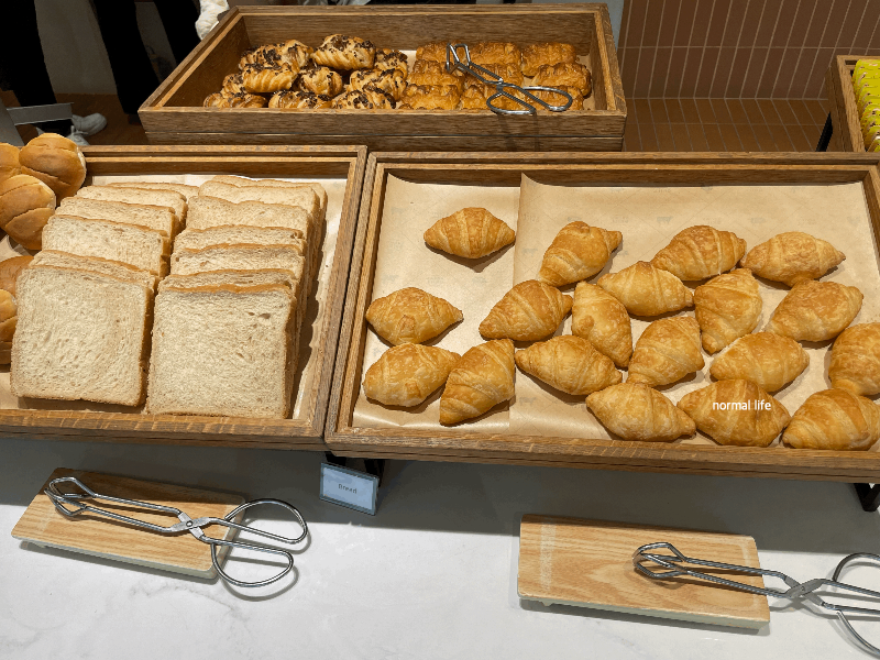 곡물식빵, 모닝빵, 미니크루아상, 페스츄리, 버터, 잼 등이 준비되어 있다.