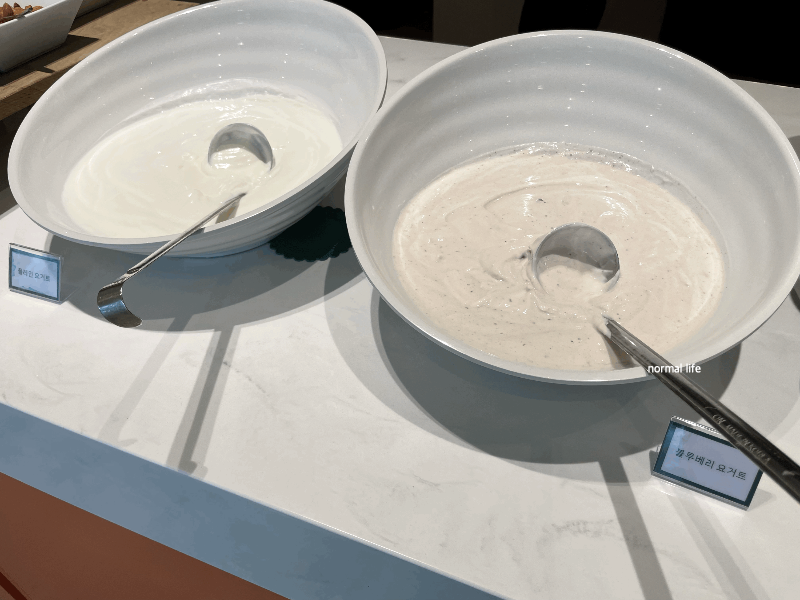 플레인 요거트와 블루베리 요거트가 준비되어 있어 과일 또는 시리얼과 함께 즐길 수 있다.