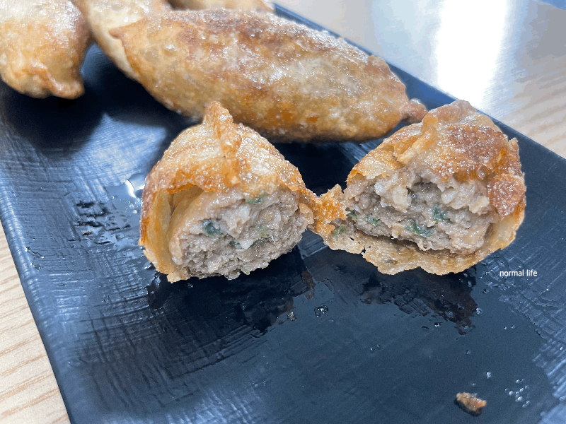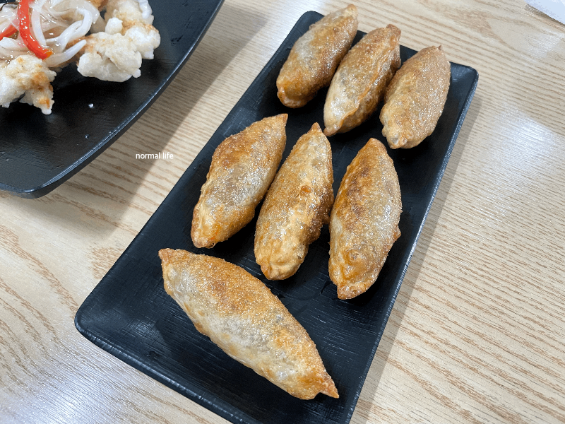 갓 튀겨낸 바삭한 갈비군만두가 7개 제공된다. 바삭한 만두피에 달콤 짭짤한 돼지갈비를 다져 넣어 씹는 맛이 가득한 갈비군만두이다.