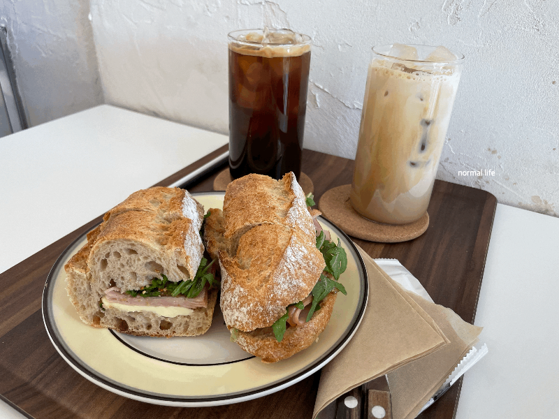 고소한 바게트에 잠봉뵈르, 신선한 루꼴라, 고메버터가 들어간 루꼴라 잠봉샌디와 아이스 아메리카노, 아이스 카페라떼를 주문하였다. 바삭한 바게트에 고소한 고메버터와 짭짤한 잠봉이 잘 어울렸으며 중간중간 씹히는 할라피뇨가 매력 있었다. 자칫 느끼할 수 있는 잠봉샌드를 할라피뇨의 매콤함으로 잡아줬다.
