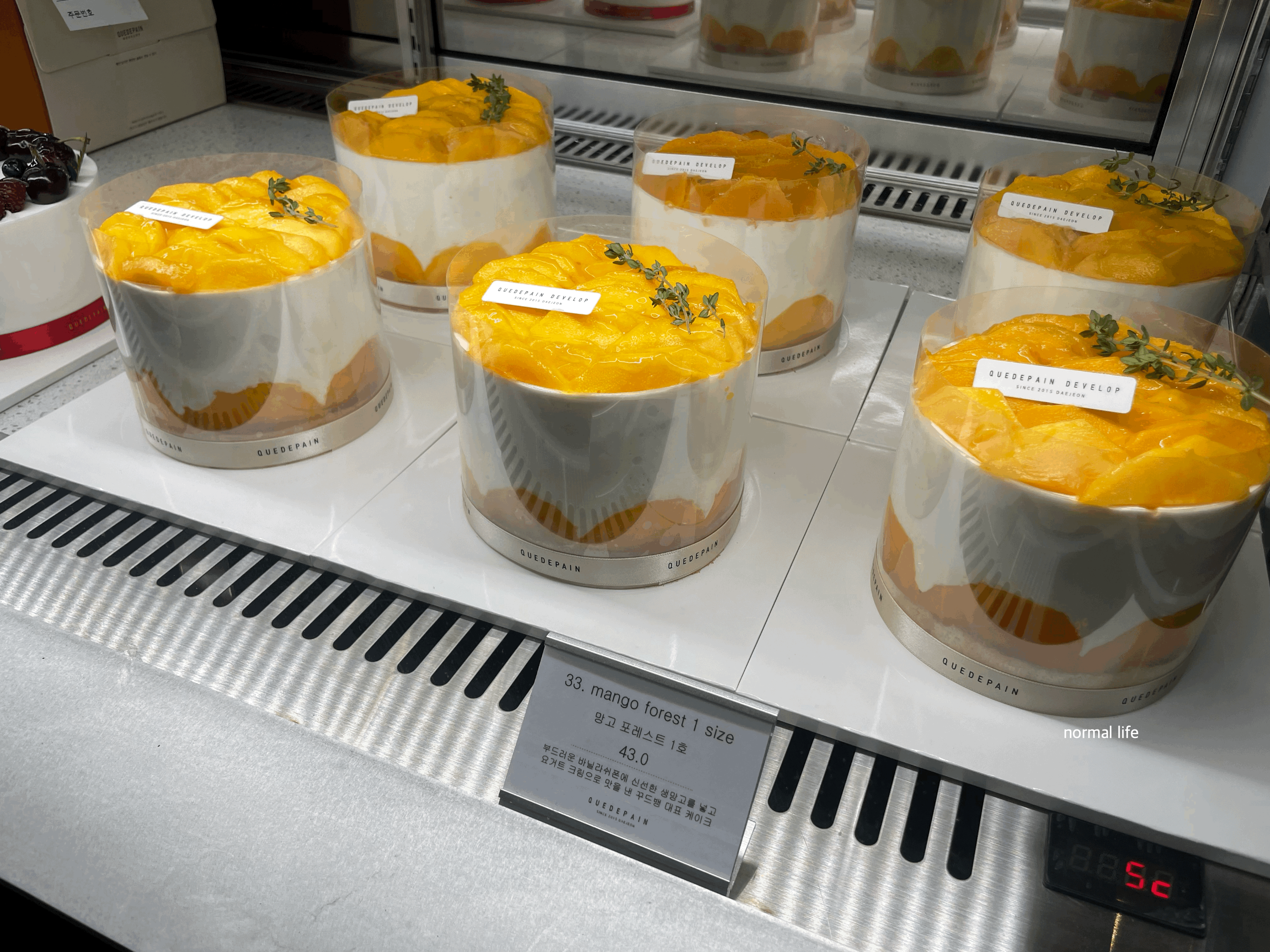 부드러운 바닐라 쉬폰에 요거트 크림과 신선한 생망고 가득 올라간 지금 15.5cm의 망고포레스트 1호 43,000원이다. 지름 11.5cm의 망고숲미니포레스트 31,000원 망고티라미수 8,300원이다.