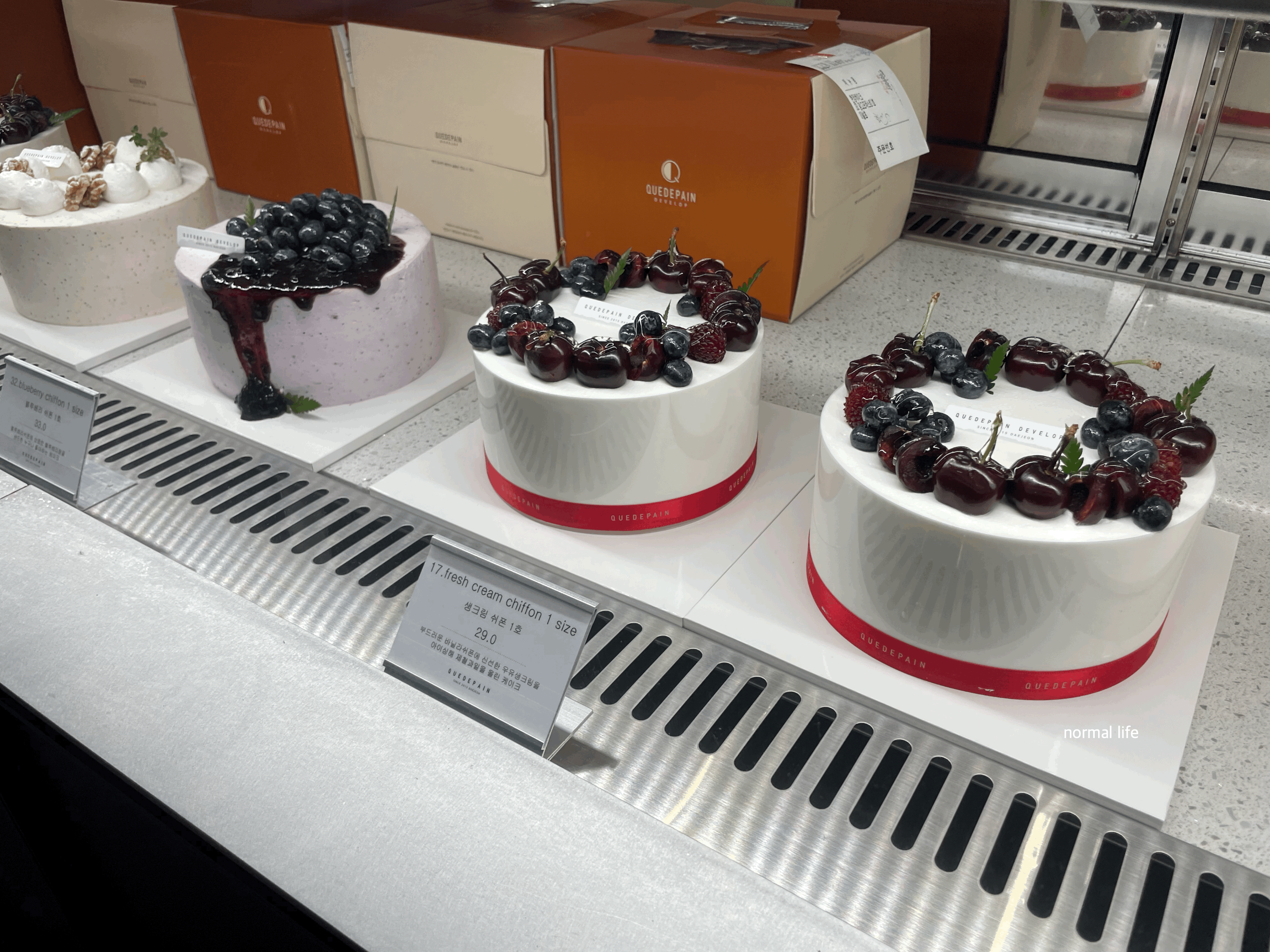 제철과일이 듬뿍 올라간 시즌 케이크와 생크림 쉬폰, 얼그레이 쉬폰, 블루베리 쉬폰, 초코케이크 등 개성 넘치는 꾸드뱅의 케이크가 쇼케이스에 가득했다.