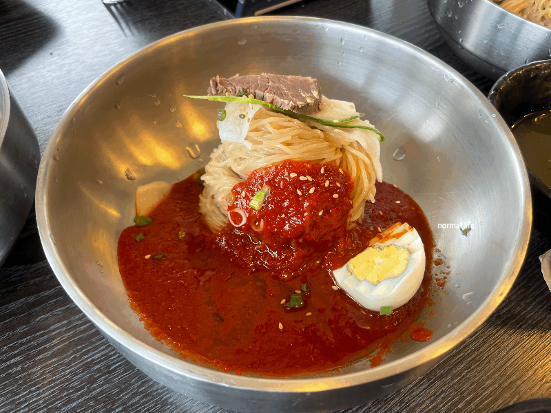 동치미, 토종닭, 표고버섯, 사과, 파인애플, 양파, 생각, 마늘, 다시마로 만든 평양원냉면의 냉면장으로 맛을 낸 메밀비빔냉면이다.