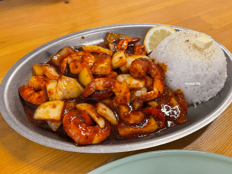 매콤한 칠리베이스의 통통한 새우와 쌀밥을 함께 맛볼 수 있는 쉬림프 라이스이다. 알싸한 양파, 식감이 좋은 파프리카, 큼직한 새우를 함께 볶아 불맛 가득하다. 밥 위에 올려진 버터를 비벼 매콤한 쉬림프와 함께 맛보면 고소함과 매콤함을 함께 맛볼 수 있다.