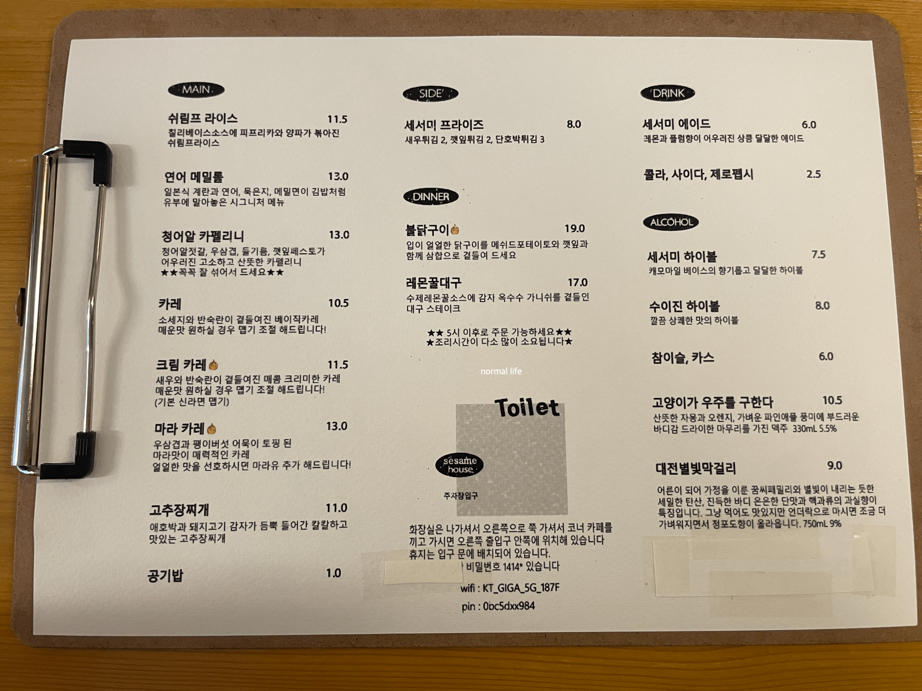 단출하지만 맛있는 퓨전메뉴들을 맛볼 수 있는 세서미하우스이다. 대표메뉴는 #쉬림프라이스 11,500원 #연어 메밀롤 13,000원 #청어알 카펠리니 13,000이다. 베이직한 맛 #카레 10,500원 매콤 크리미한 #크림 카레 11,500원 얼얼한 마라맛 #마라 카레 13,000원 애호박, 돼지감자, 감자가 들어간 #고추장찌개 11,000원 #세서미프라이즈 8,000원이다. 오후 5시 이후 주문 가능한 #불닭구이 19,000원 #레몬꿀대구 17,000원이다.