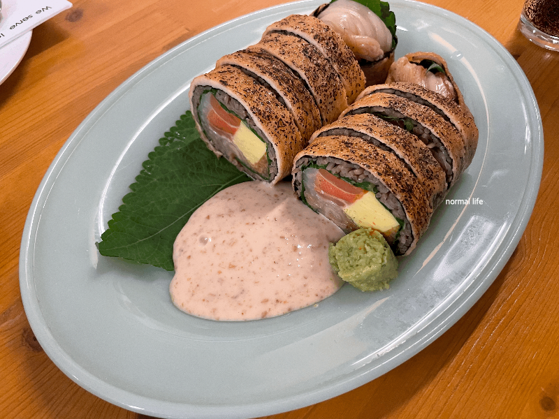메밀면을 김밥처럼 유부에 말아놓은 시그니처 메뉴 연어 메밀롤이다. 일본식 계란, 신선한 연어, 씻은 묵은지, 고소한 메밀면을 김과 유부로 말아놓았다. 특별한 참깨소스와 매콤한 와사비와 듬뿍 곁들여 맛보면 더 맛있게 맛볼 수 있다.