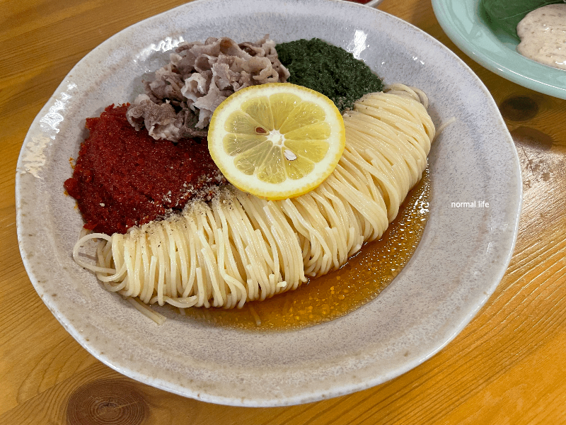 무더운 여름과 잘 어울리는 시원하고 상큼한 청어알 카펠리니이다. 청어알 젓갈, 우삼겹, 들기름, 깻잎페스토, 레몬이 올라간 냉파스타이다. 고소하고 상큼한 카펠리니가 입맛을 돋운다.