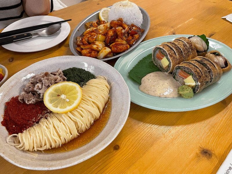 세서미하우스 시그니처 메뉴 위주로 주문한 우리 테이블이다. 청어알 카펠리니는 냉파스타보다는 한국식 비빔국수 느낌이 강했다. 연어 메밀롤이 내가 뽑은 베스트메뉴이다. 신선한 연어, 두툼한 일본식 계란, 씻어내 개운한 묵은지 조합이 훌륭해 은은하게 계속 생각나는 메뉴이다.