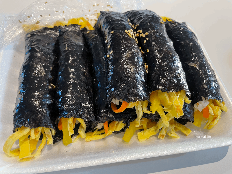 6세 딸아이와 점심이나 저녁 식사 대용으로 둘둘꼬마김밥에서 가끔 포장을 한다. 김밥을 좋아하지 않는 딸아이인데 계란 지단 가득 들어가 고소한 맛이 특징인 둘둘꼬마김밥의 계란꼬마김밥을 좋아한다.