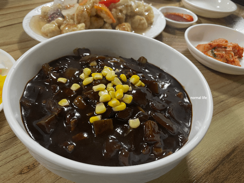 두껍지 않은 면발이 짜장 소스와 잘 어울려서 달고 짠맛이 강하지 않은 우성관의 짜장면이다. 짜장 위에 노란 옥수수가 어린 시절 추억의 짜장면을 생각나게했다.