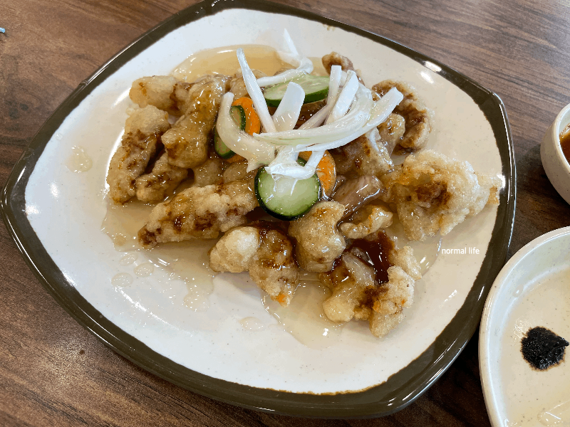 기존 탕수육과는 다른 신관짬뽕 탕수육의 튀김옷이 눈에 띄었다. 기존에 맛보았던 녹말가루나 찹쌀가루로 반죽한 탕수육이 아닌 옛날통닭 튀김옷과 같은 탕수육이었다.