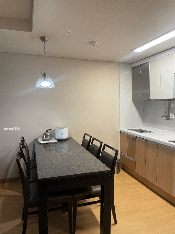 주방에는 6명이 식사할 수 있는 넓은 식탁이 준비되어 있다. 냉장고, 전기밥솥, 인덕션, 전자레인지, 프라이팬, 냄비, 식기 등이 준비되어 있어 냄새나는 음식인 생선, 고기 외에는 음식 조리가 가능하다.