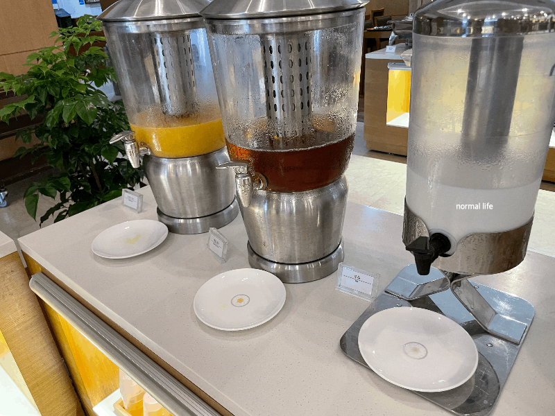 음료 디스펜서에는 오렌지주스, 매실주스, 흰 우유가 준비되어 있어 취향껏 맛볼 수 있다.