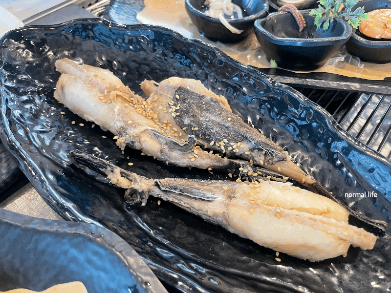 청포묵무침, 고구마맛탕, 간장게장, 미역국, 콘옥수수, 간자미회무침, 계란찜, 궁채나물, 새우초밥이 스끼다시로 제공된다.