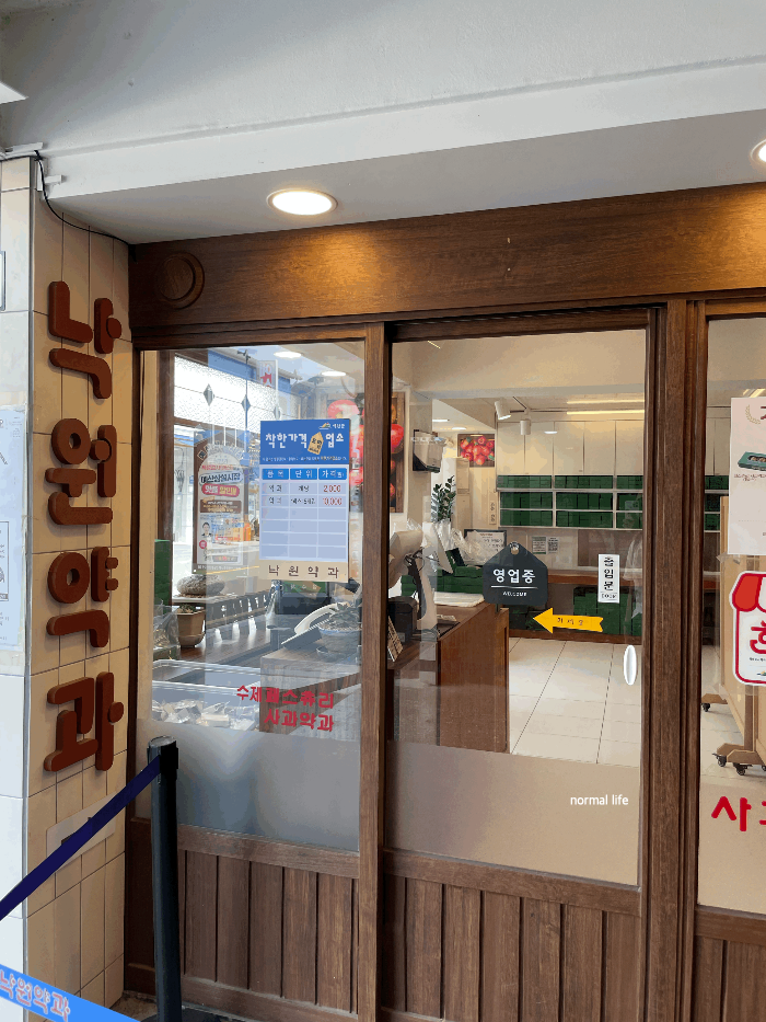 예산시장 7번 입구에 위치한 낙원약과이다. 장터광장의 신광정육점 우측골목으로 들어온 후 첫 번째 우측골목에서 낙원약과를 찾을 수 있다.