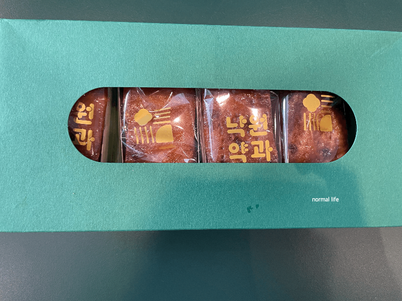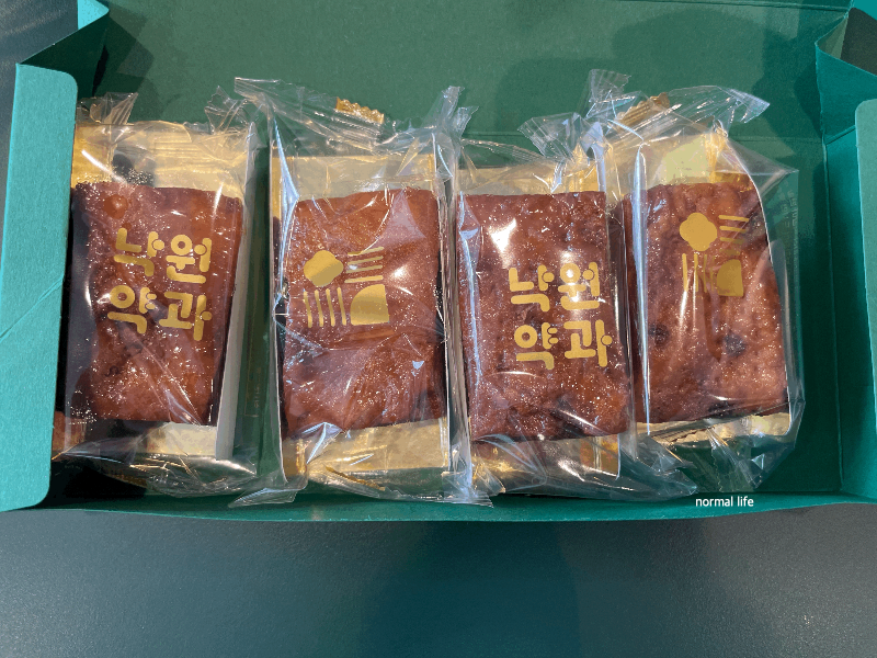 한식 디저트 약과가 인기인 요즘, 낙원약과의 패키지는 세련된 느낌이 가득했다. 약과는 하얀 스티로폼 접시에 포장되어 판매하는게 흔한데 녹색 상자에 개별포장된 낙원약과는 선물용으로도 손색이 없었다.