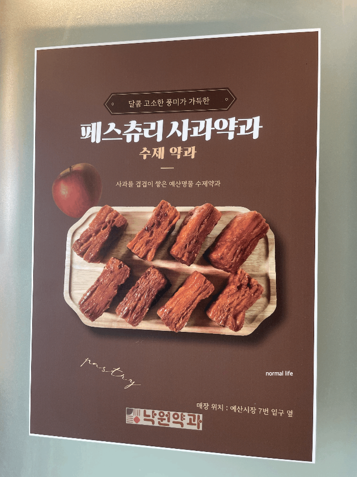다양한 먹거리와 특별한 디저트가 가득한 예산시장을 방문해 보았다. 명절이나 할머니가 드시던 약과를 이제는 약게팅에 성공해야만 맛볼 수 있는 대표 K-디저트가 되었다. 지역 특산물인 예산 사과로 만든 사과잼과 조청을 겹겹이 쌓아 만든 페스츄리 사과약과이다. 예산시장에서만 맛볼 수 있는 특별한 약과를 꼭 맛보길 추천하고 싶다.