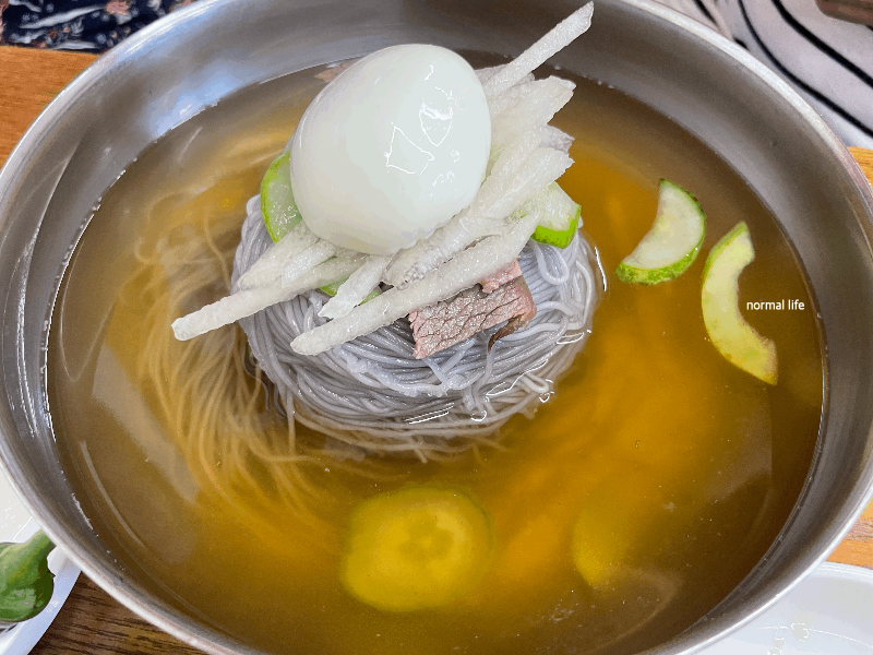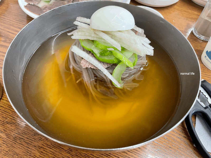 메뉴가 나오기 전 따뜻한 면수를 내어주신다. 면을 삶은 고소한 물에 적당히 간이 되어있어 식전 입맛을 돋운다. 대동면옥은 평양식과 함흥식으로 선택하여 주문할 수 있다. 메밀면을 맛볼 수 있는 평양식, 고구마전분으로 만든 쫄깃한 면을 맛볼 수 있는 함흥식이다. 대동면옥은 함흥식 냉면 판매량이 더 많다고 한다.