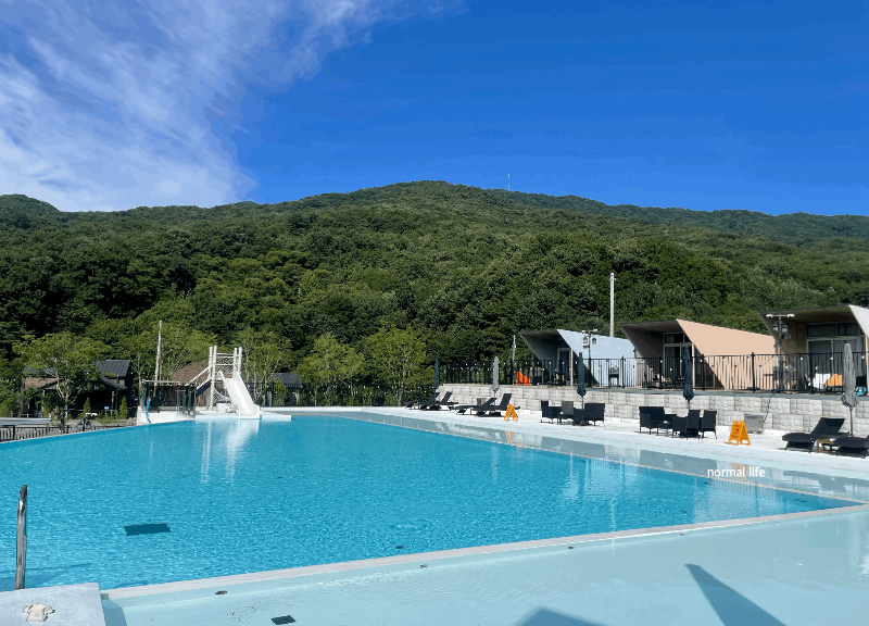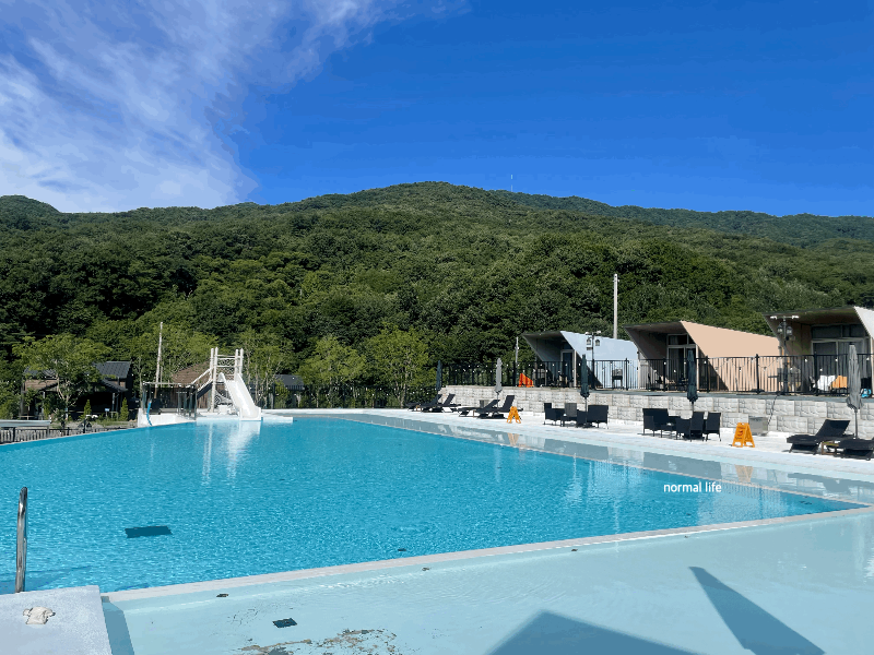 히어위고글램핑장 수영장 개장시간은 오전 10시이다. 미온수 수영장 이용요금은 인당 5,000원 썬베드 대여료 10,000원 구명조끼 튜브대여 5,000원이다.