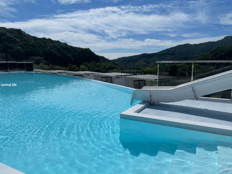 수심이 1.25 인피니티풀과 수심이 얕은 유아풀장이 있다. 미온수풀로 6살 딸아이가 물놀이하기에도 춥지 않고 적당했다. 아이에게 인기 만점이었던 미끄럼틀은 구명조끼 필수 착용하고 이용하여야 한다. 인피니티풀은 50분 이용 10분 휴식시간이 있다.