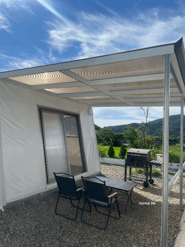 무더운 여름이었지만 에어컨이 있어 시원한 텐트 안에서 더위를 피할 수 있었다. 냉난방기가 준비되어 있어 더위와 추위에도 쾌적한 캠핑을 즐길 수 있다. 캠핑 의자, 테이블, 바베큐 그릴이 야외에 준비되어 있고, 텐트 안에도 그릴, 버너, 4인 테이블이 준비되어 있다.